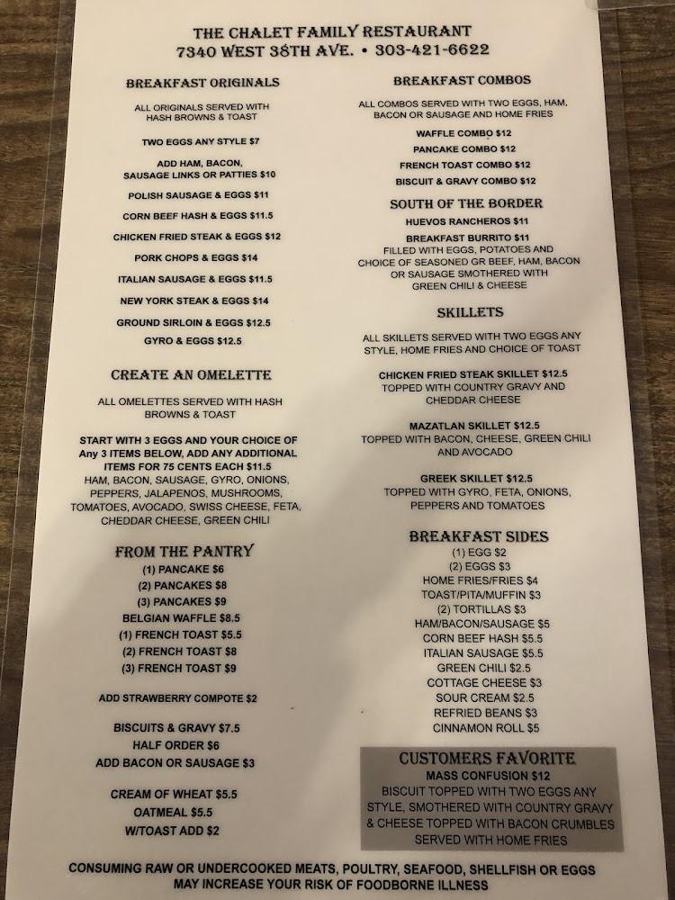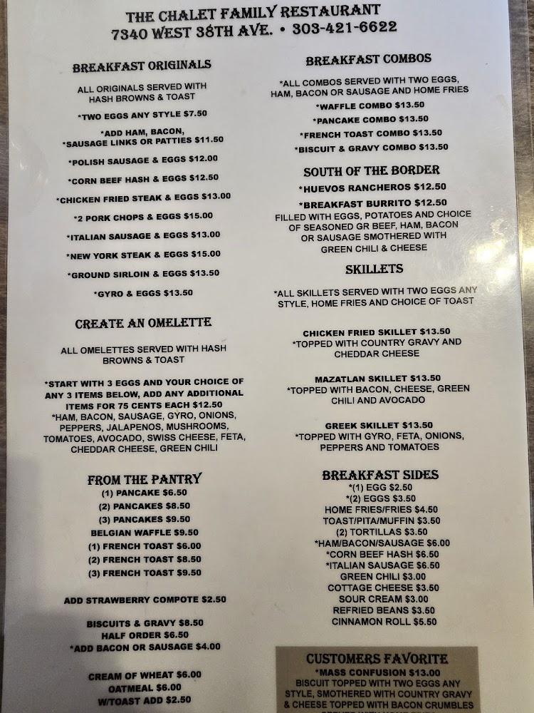 Welcome to Chalet, your cozy family-friendly restaurant in Wheat Ridge, CO, where deliciousness meets comfort! Nestled at 7340 W 38th Ave, we specialize in serving hearty breakfasts, delightful lunches, and satisfying dinners at affordable prices, ranging from $10 to $20. Our menu features excellent coffee, simple and traditional dishes, and shareable small plates. Enjoy a relaxed atmosphere perfect for groups or solo dining. With accessible seating and amenities, we cater to all, including children. Whether you're in for a quick takeout or a sit-down meal, Chalet is your perfect spot to savor great food in a warm environment. We accept reservations and various payment methods for your convenience.