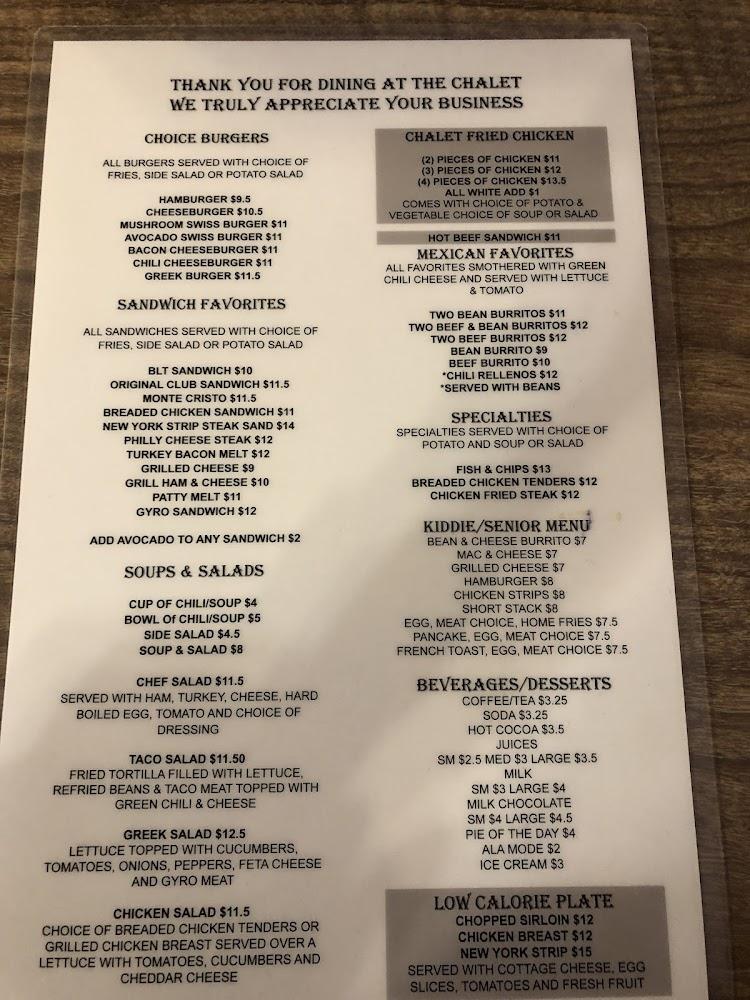 Chalet's menu is a delightful mix of classic diner fare. Breakfast options reign supreme, showcasing mouth-watering pancakes, omelets, and more. Signature dishes, such as biscuits and gravy, grab diners' attention. Hearty lunch options include burgers and sandwiches, perfect for a fulfilling meal any time of day.